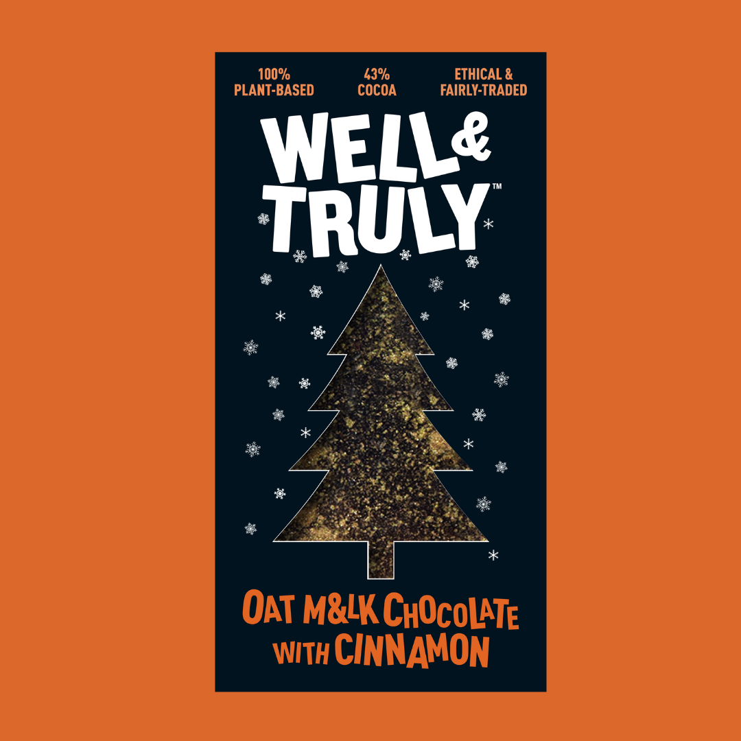 HO-HO-HOLIDAY VEGAN-FRIENDLY WELL&TRULY OAT MILK CHOCOLATE CHRISTMAS BAR GENEROUSLY SPRINKLED WITH CINNAMON.